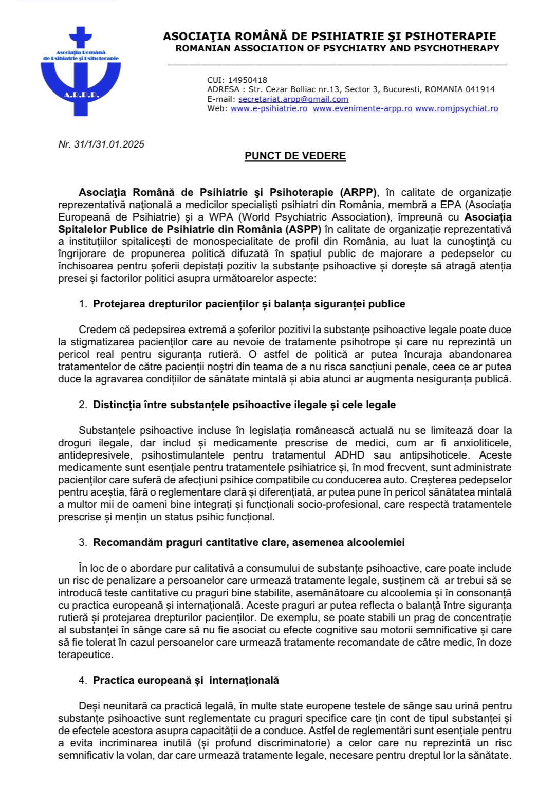Similar practicii europene și internaționale, credem că introducerea de praguri cantitative similare cu cele ale alcoolemiei ar putea reprezenta o soluție justă și mai precisă pentru a asigura atât siguranța rutieră, cât și protejarea drepturilor pacienților.”